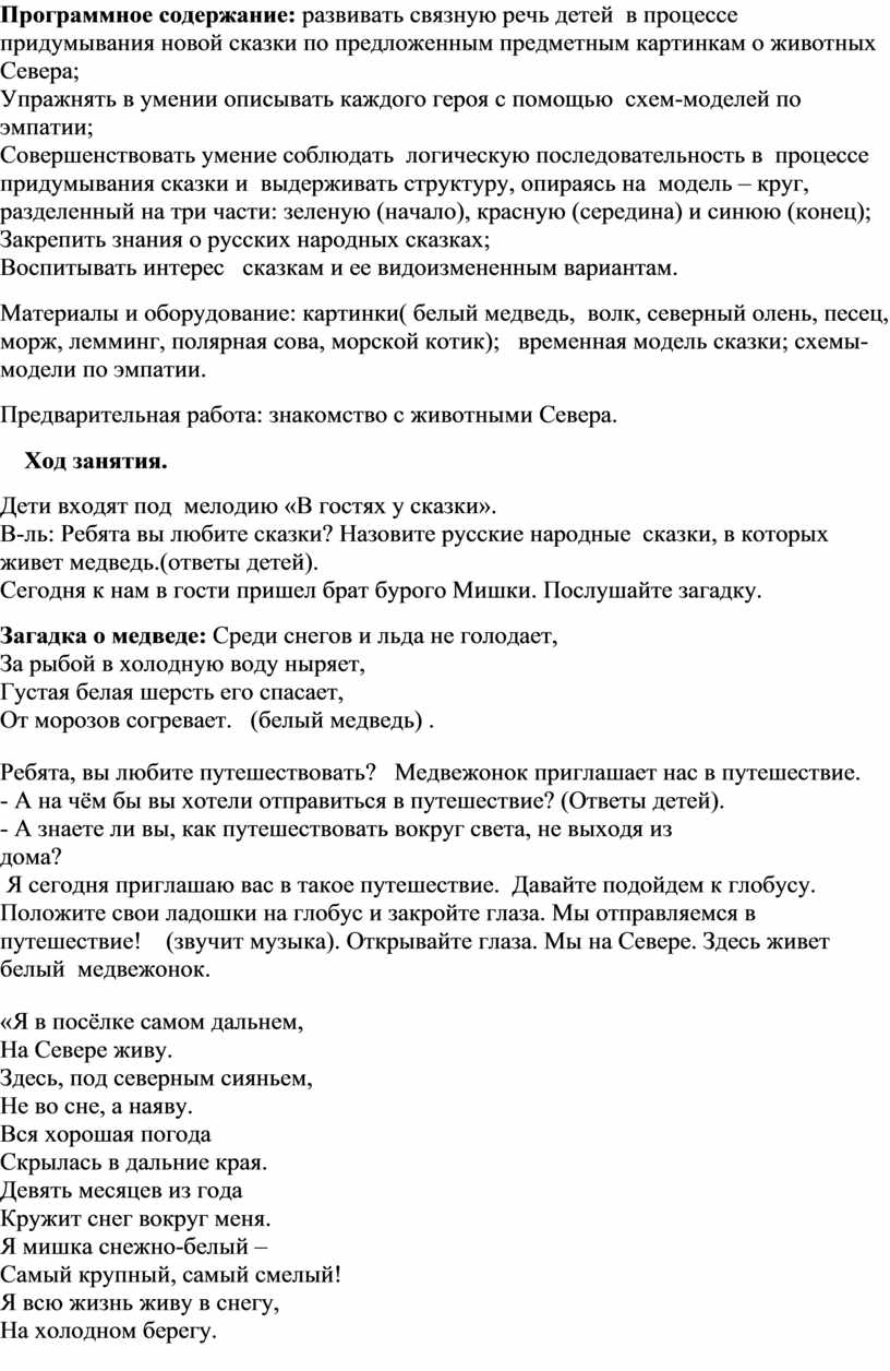 Программное содержание: развивать связную речь детей в процессе придумывания новой сказки по предложенным предметным картинкам о животных Севера; Упражнять в умении описывать каждого героя с помощью схем-моделей по эмпатии; Совершенствовать умение соблюдать логическую последовательность в процессе придумывания сказки и выдерживать структуру, опираясь на модель – круг, разделенный на три части: зеленую (начало), красную (середина) и синюю (конец); Закрепить знания о русских народных сказках; Воспитывать интерес сказкам и ее видоизмененным вариантам.