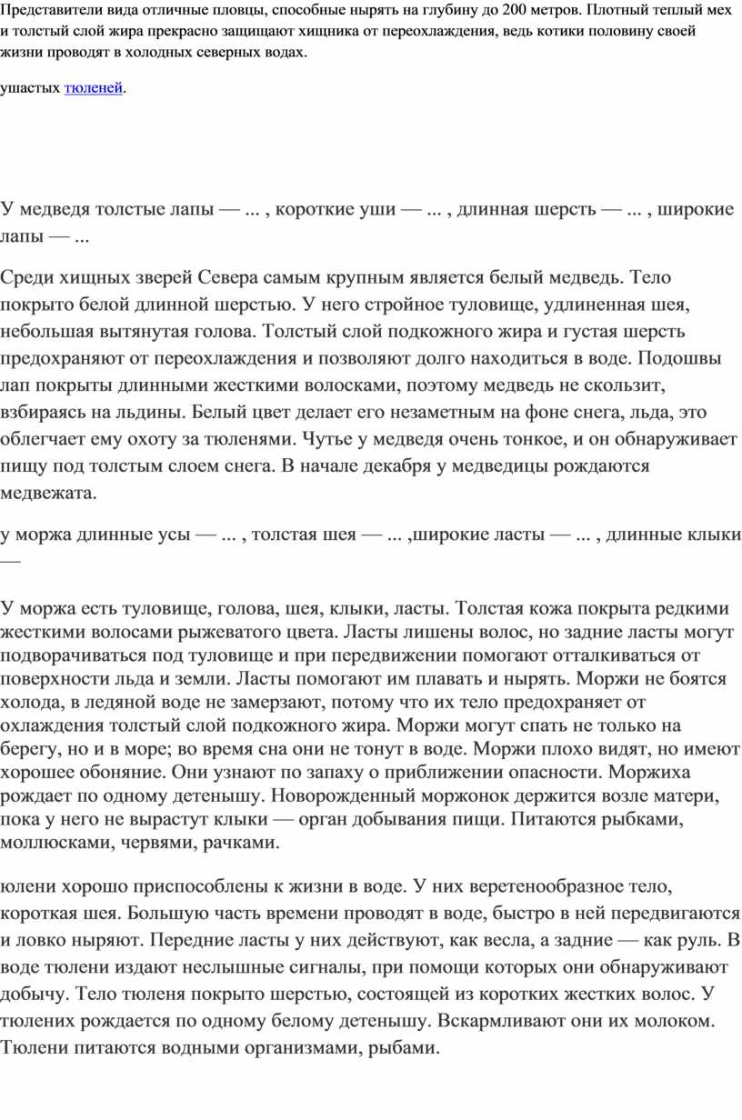 Среди хищных зверей Севера самым крупным является белый медведь. Тело покрыто белой длинной шерстью. У него стройное туловище, удлиненная шея, небольшая вытянутая голова. Толстый слой подкожного жира и густая шерсть предохраняют от переохлаждения и позволяют долго находиться в воде. Подошвы лап покрыты длинными жесткими волосками, поэтому медведь не скользит, взбираясь на льдины. Белый цвет делает его незаметным на фоне снега, льда, это облегчает ему охоту за тюленями. Чутье у медведя очень тонкое, и он обнаруживает пищу под толстым слоем снега. В начале декабря у медведицы рождаются медвежата.