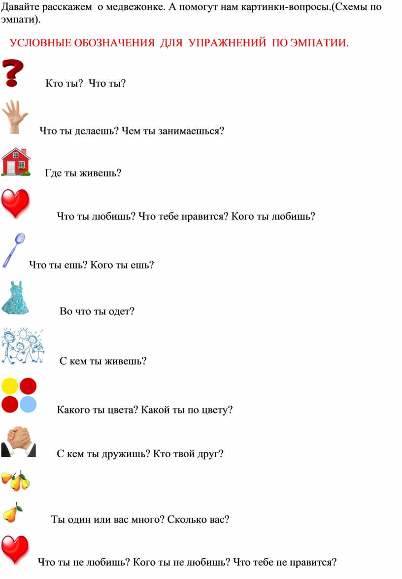 Давайте расскажем о медвежонке. А помогут нам картинки-вопросы.(Схемы по эмпати).