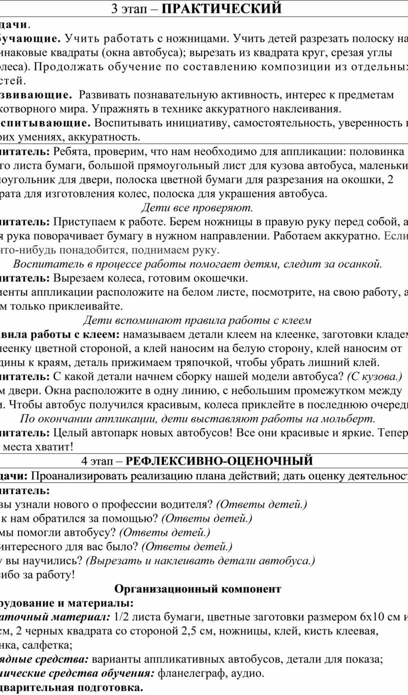 Воспитатель: Ребята, проверим, что нам необходимо для аппликации: половинка белого листа бумаги, большой прямоугольный лист для кузова автобуса, маленький прямоугольник для двери, полоска цветной бумаги для разрезания на окошки, 2 квадрата для изготовления колес, полоска для украшения автобуса.