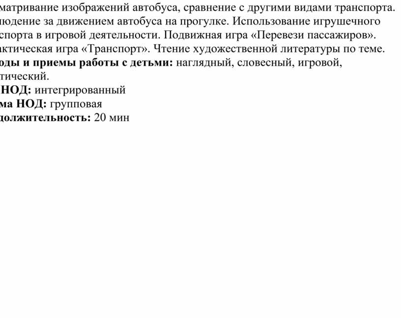 Рассматривание изображений автобуса, сравнение с другими видами транспорта. Наблюдение за движением автобуса на прогулке. Использование игрушечного транспорта в игровой деятельности. Подвижная игра «Перевези пассажиров». Дидактическая игра «Транспорт». Чтение художественной литературы по теме.