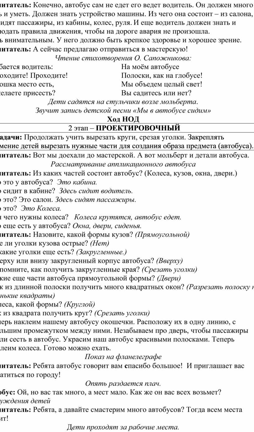 Задачи: Продолжать учить вырезать круги, срезая уголки. Закреплять умение детей вырезать нужные части для создания образа предмета (автобуса). |