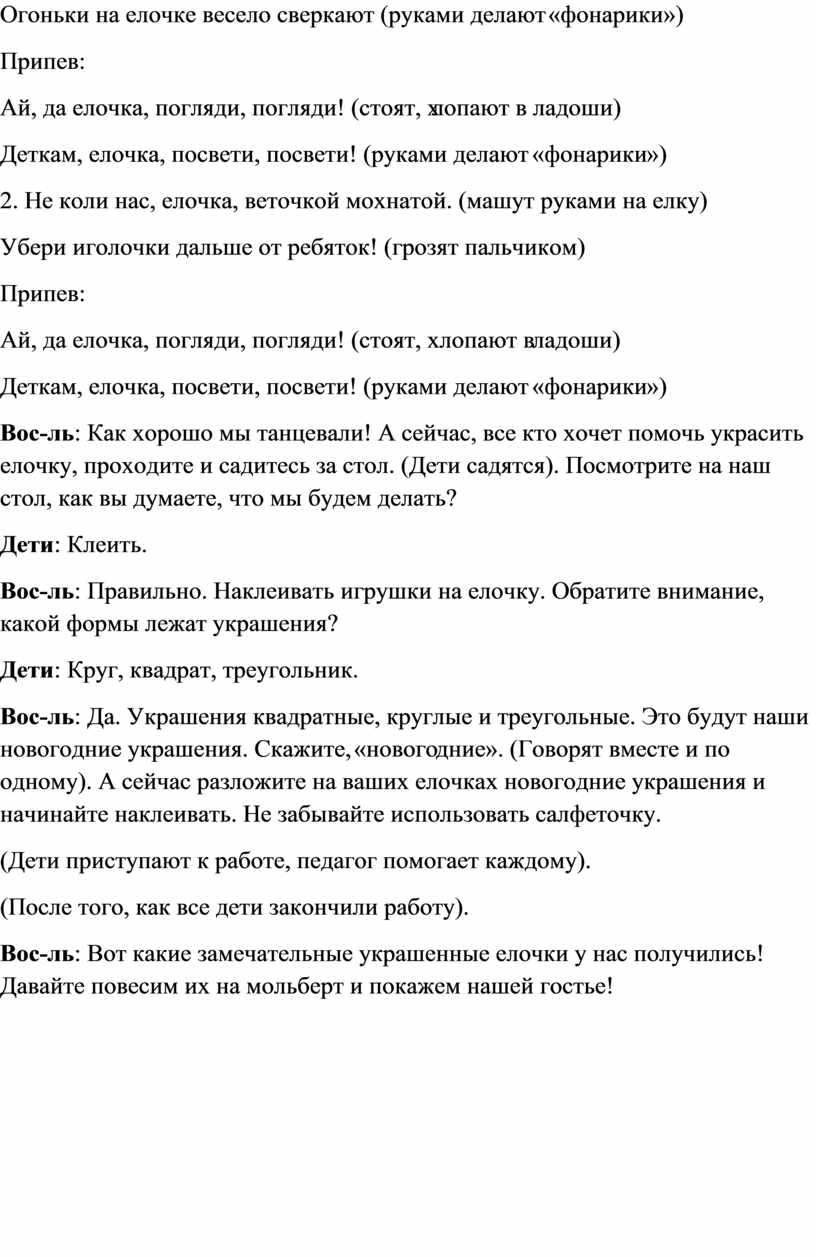 Вос-ль: Знаете, ребята, не всегда игрушки были такие красивые. Очень давно, когда только придумали украшать елочку, игрушки делали из ткани, дерева, ваты, бумаги; в качестве украшений использовали конфеты и печенье. А сейчас у нас с вами есть вот такие красивые елочные украшения. Но наша гостья грустит и нам пора ей помочь. Сначала давайте мы ее развеселим; как мы можем это сделать?