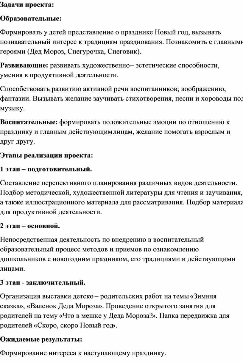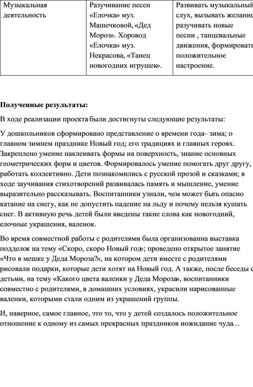 У дошкольников сформировано представление о времени года – зима; о главном зимнем празднике Новый год; его традициях и главных героях. Закреплено умение наклеивать формы на поверхность, знание основных геометрических форм и цветов. Формировалось умение помогать друг другу, работать коллективно. Дети познакомились с русской прозой и сказками; в ходе заучивания стихотворений развивалась память и мышление, умение выразительно рассказывать. Воспитанники узнали, чем может быть опасно катание на снегу, как не допустить падение на льду и почему нельзя кушать снег. В активную речь детей были введены такие слова как новогодний, елочные украшения, валенок.