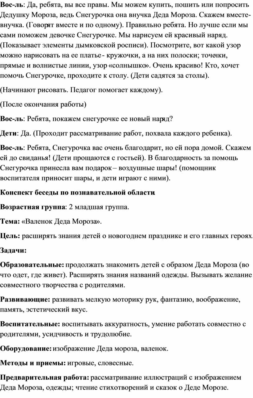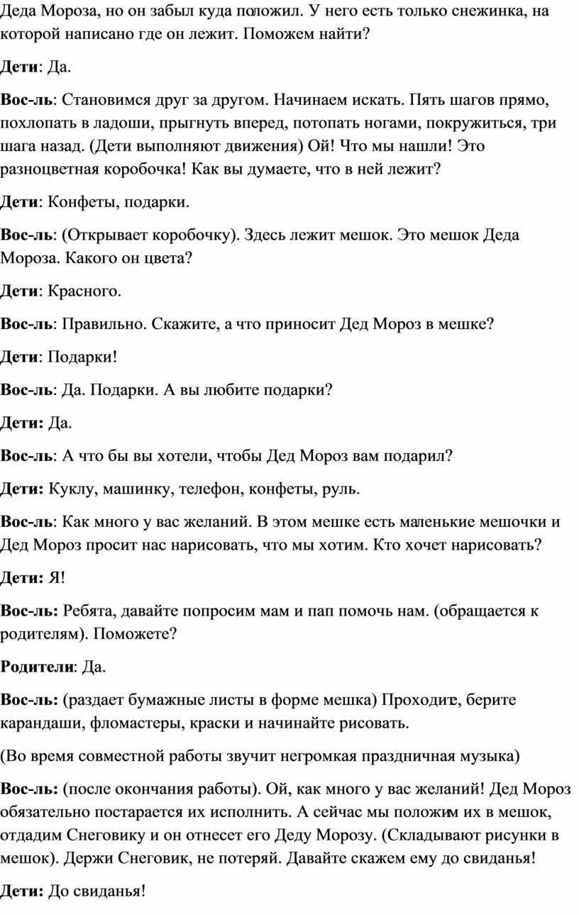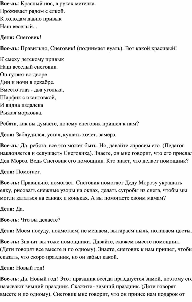 Вос-ль: Да, ребята, все это может быть. Но, давайте спросим его. (Педагог наклоняется и «слушает» Снеговика). Знаете, он мне говорит, что его прислал Дед Мороз. Ведь Снеговик его помощник. Кто знает, что делает помощник?