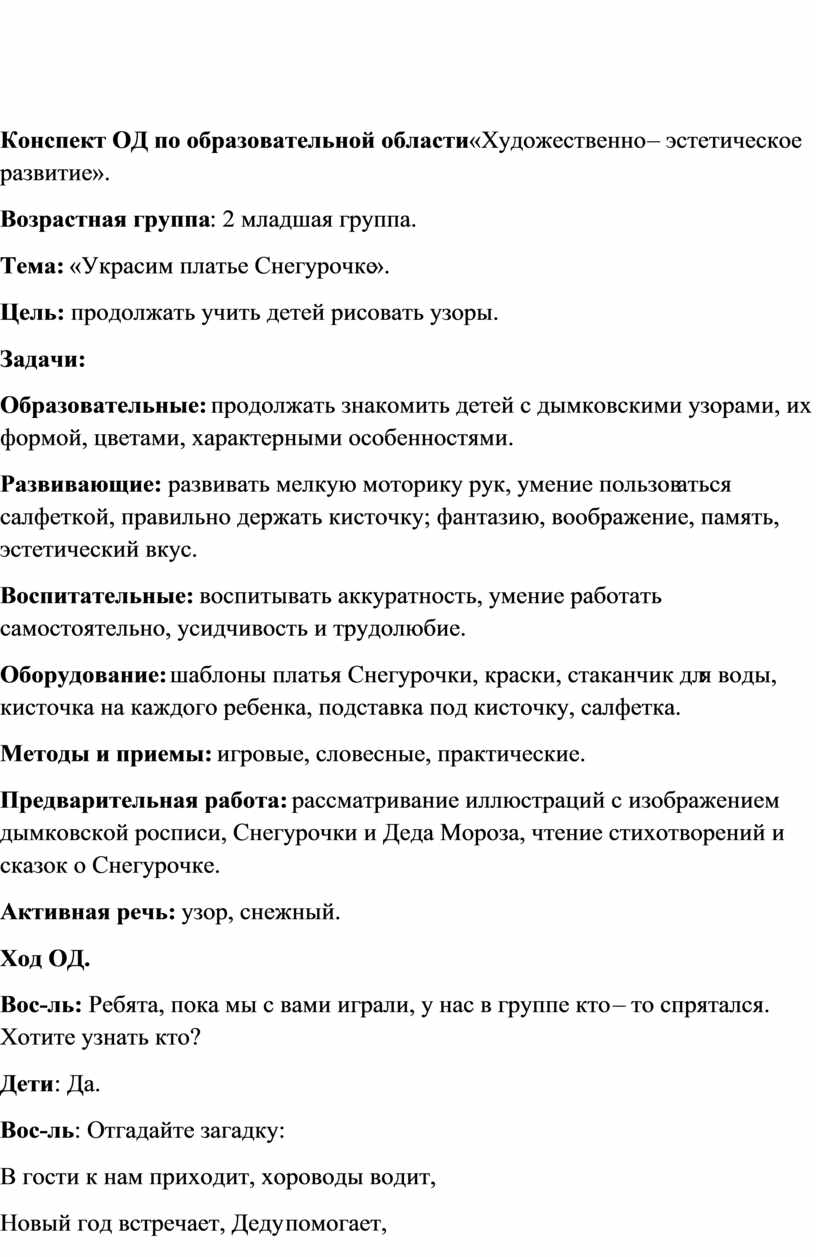 Конспект ОД по образовательной области «Художественно –