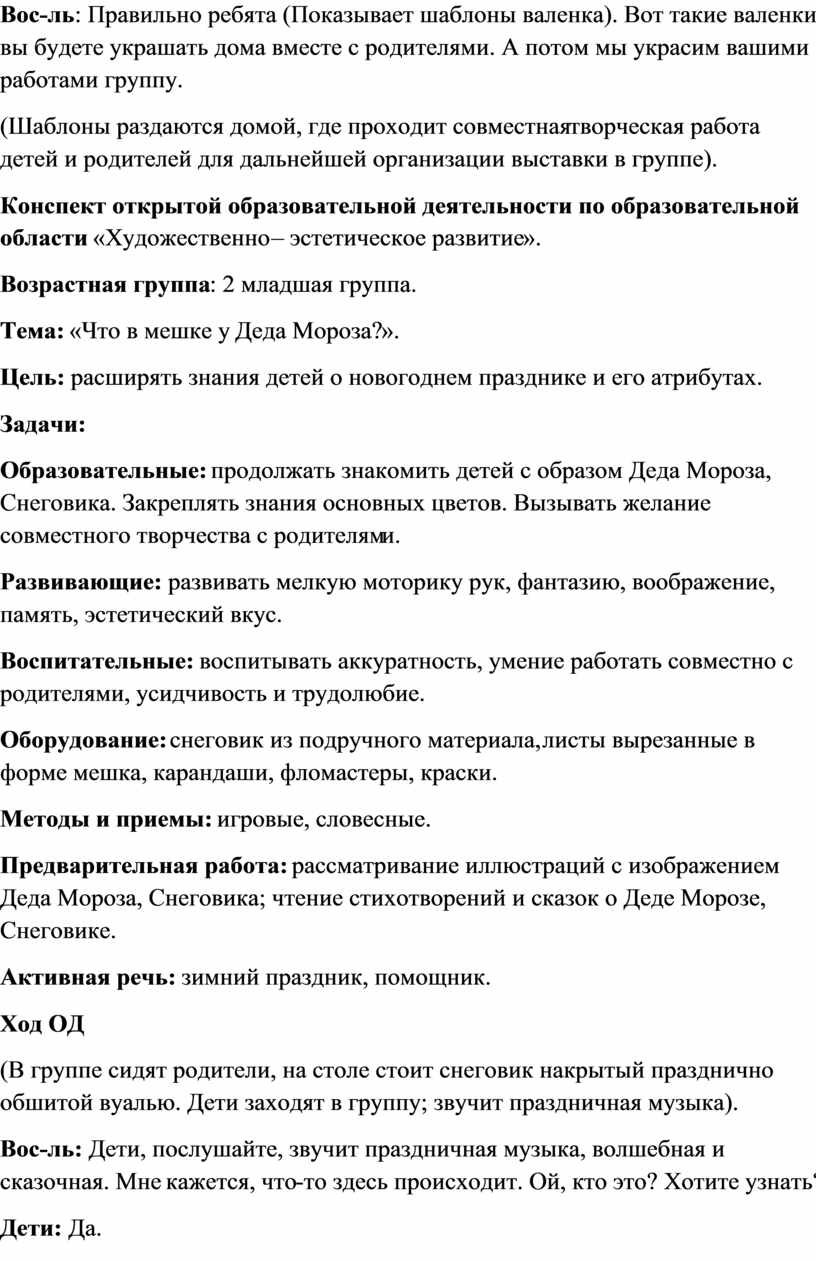 Вос-ль: Вот такие валенки носит Дед Мороз. Он обувает их на ноги и ходит по снегу. Но у Дедушки валенок серый, без узоров. Хотите украсить обувь Деда Мороза вместе с мамой и папой?