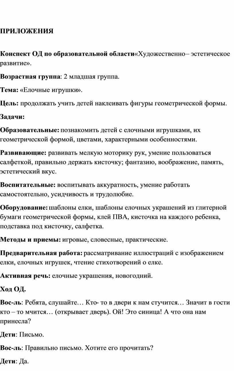 Оборудование: шаблоны елки, шаблоны елочных украшений из глитерной бумаги геометрической формы, клей ПВА, кисточка на каждого ребенка, подставка под кисточку, салфетка.