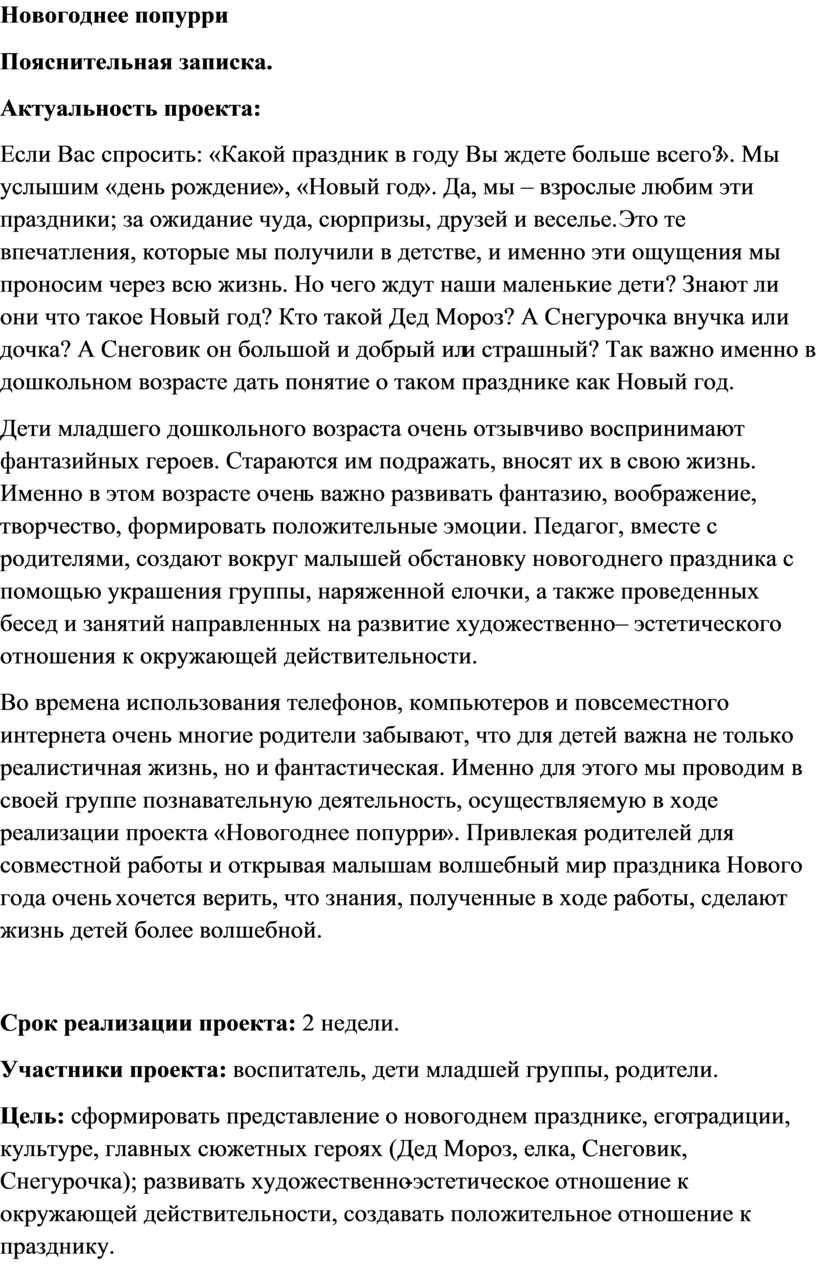 Во времена использования телефонов, компьютеров и повсеместного интернета очень многие родители забывают, что для детей важна не только реалистичная жизнь, но и фантастическая. Именно для этого мы проводим в своей группе познавательную деятельность, осуществляемую в ходе реализации проекта «Новогоднее попурри». Привлекая родителей для совместной работы и открывая малышам волшебный мир праздника Нового года очень хочется верить, что знания, полученные в ходе работы, сделают жизнь детей более волшебной.
