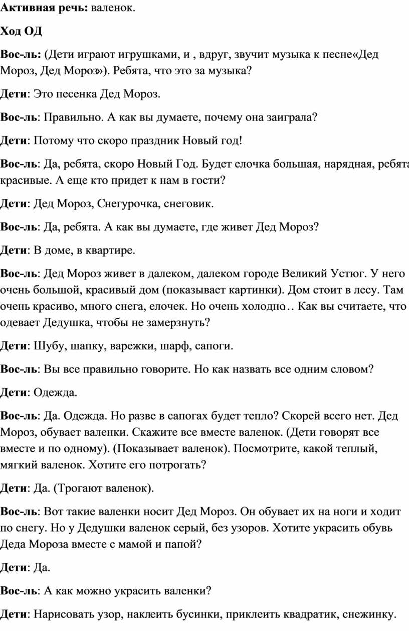 Вос-ль: Да. Одежда. Но разве в сапогах будет тепло? Скорей всего нет. Дед Мороз, обувает валенки. Скажите все вместе валенок. (Дети говорят все вместе и по одному). (Показывает валенок). Посмотрите, какой теплый, мягкий валенок. Хотите его потрогать?