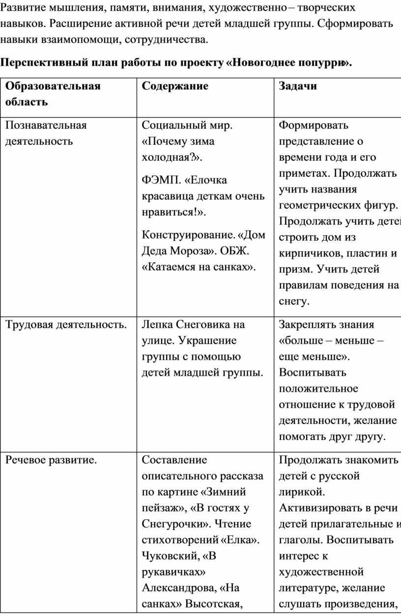 Перспективный план работы по проекту «Новогоднее попурри».