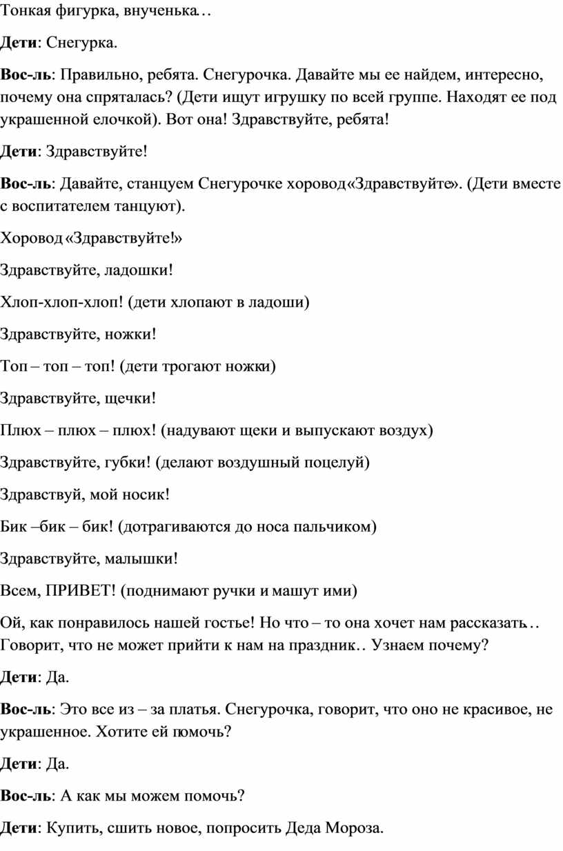 Вос-ль: Значит вы тоже помощники. Давайте, скажем вместе помощник. (Дети говорят все вместе и по одному). Знаете, снеговик к нам пришел, чтобы сказать, что скоро праздник, но он забыл какой.
