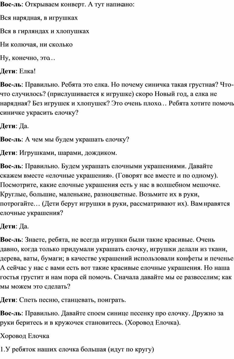 Вос-ль: Правильно. Давайте споем синице песенку про елочку. Дружно за руки беритесь и в кружочек становитесь. (Хоровод Елочка).