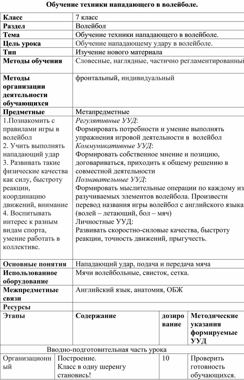 Регулятивные УУД: Формировать потребности и умение выполнять упражнения игровой деятельности в волейбол Коммуникативные УУД: Формировать собственное мнение и позицию, договариваться, приходить к общему решению в совместной деятельности Познавательные УУД: Формировать мыслительные операции по каждому из разучиваемых элементов волейбола. Произвести перевод названия игры волейбол с английского языка (волей – летающий, бол – мяч) Личностные УУД: Развивать скоростно-силовые качества, быстроту реакции, точность движений, прыгучесть.
