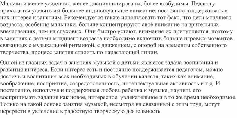 Мальчики менее усидчивы, менее дисциплинированы, более возбудимы. Педагогу приходится уделять им большее индивидуальное внимание, постоянно поддерживать в них интерес к занятиям. Рекомендуется также использовать тот факт, что дети младшего возраста, особенно мальчики, больше концентрируют своё внимание на зрительных впечатлениях, чем на слуховых. Они быстро устают, внимание их притупляется, поэтому в занятиях с детьми младшего возраста необходимо включить больше игровых моментов связанных с музыкальной ритмикой, с движением, с опорой на элементы собственного творчества, процесс занятия строить по нарастающей линии.