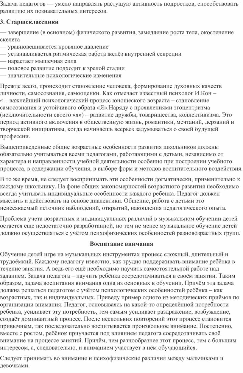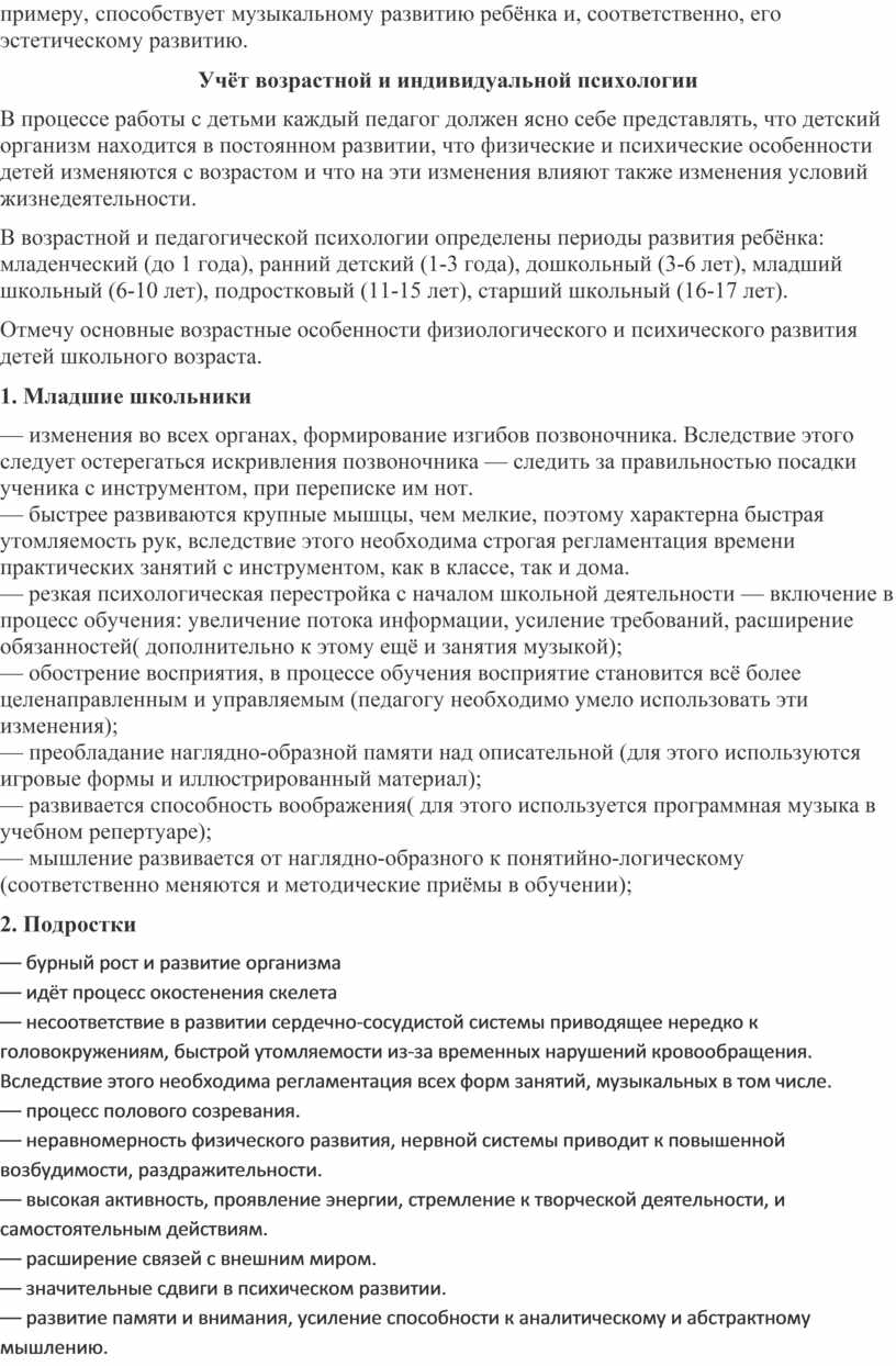 Проблема учета возрастных и индивидуальных различий в музыкальном обучении детей остается еще недостаточно разработанной, но тем не менее музыкальное обучение детей должно осуществляться с учётом психофизических особенностей разновозрастных групп.