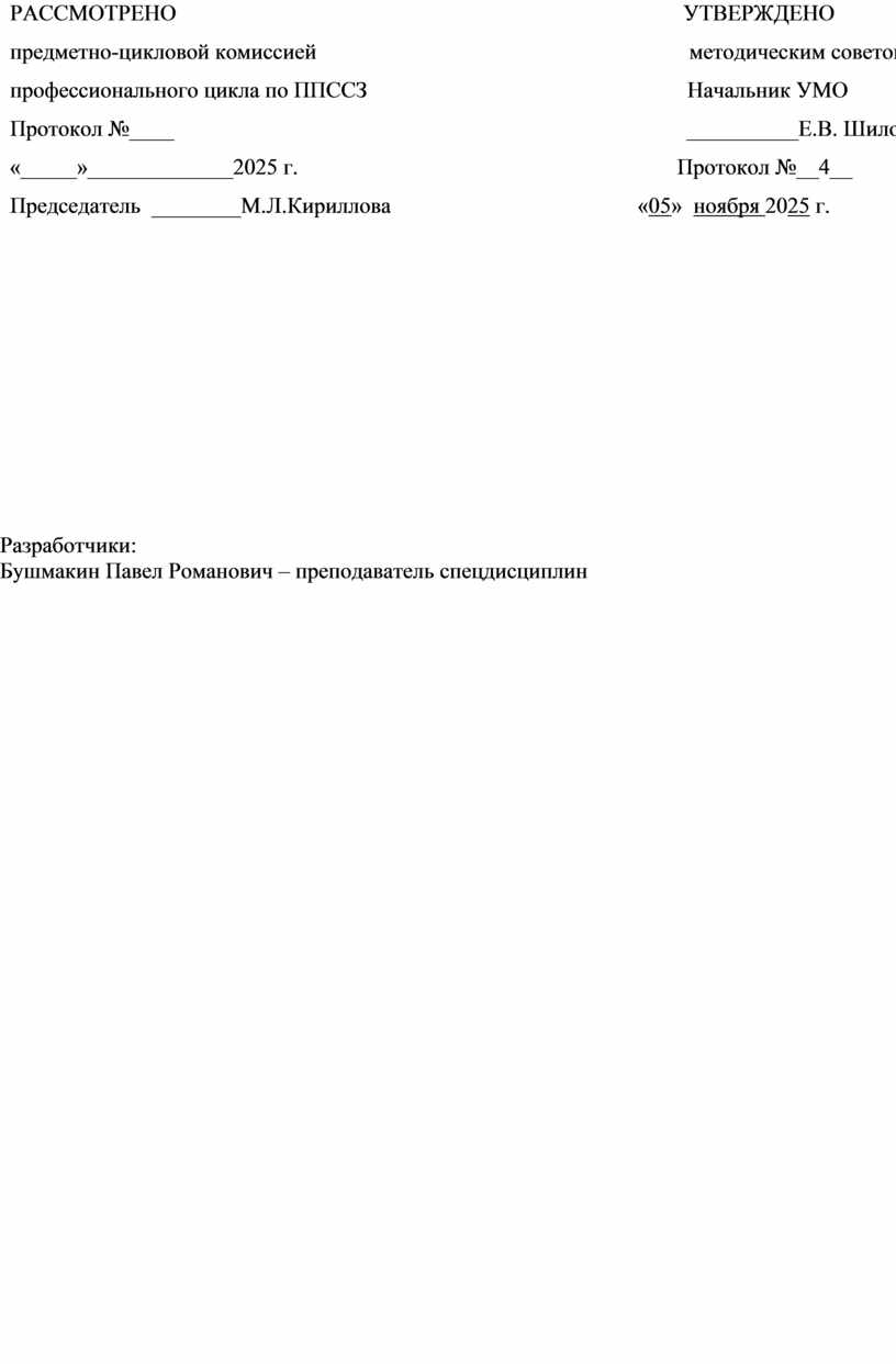РАССМОТРЕНО предметно-цикловой комиссией профессионального цикла по ППССЗ Протокол №____ «_____»_____________2025 г. Председатель ________М.Л.Кириллова |