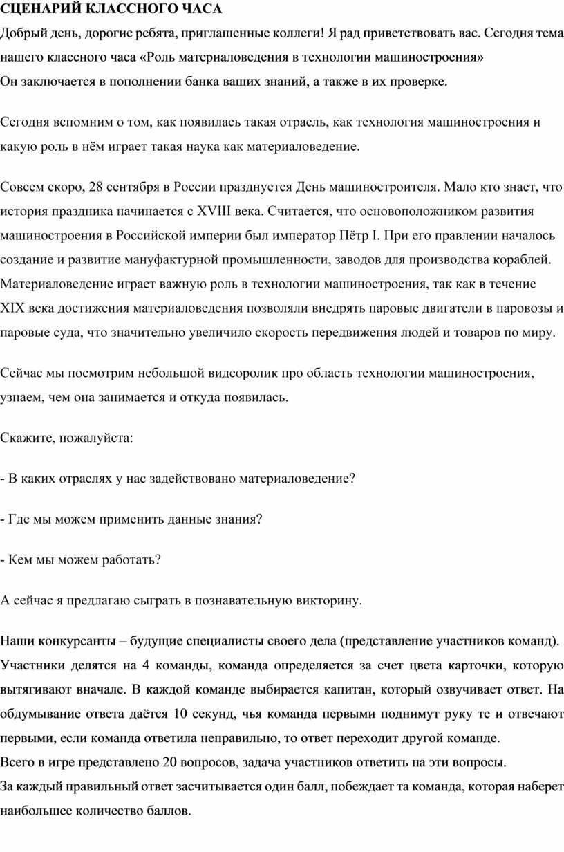 Добрый день, дорогие ребята, приглашенные коллеги! Я рад приветствовать вас. Сегодня тема нашего классного часа «Роль материаловедения в технологии машиностроения»
