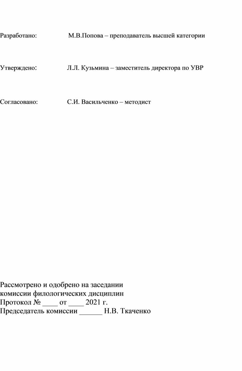 Разработано: М.В.Попова – преподаватель высшей категории