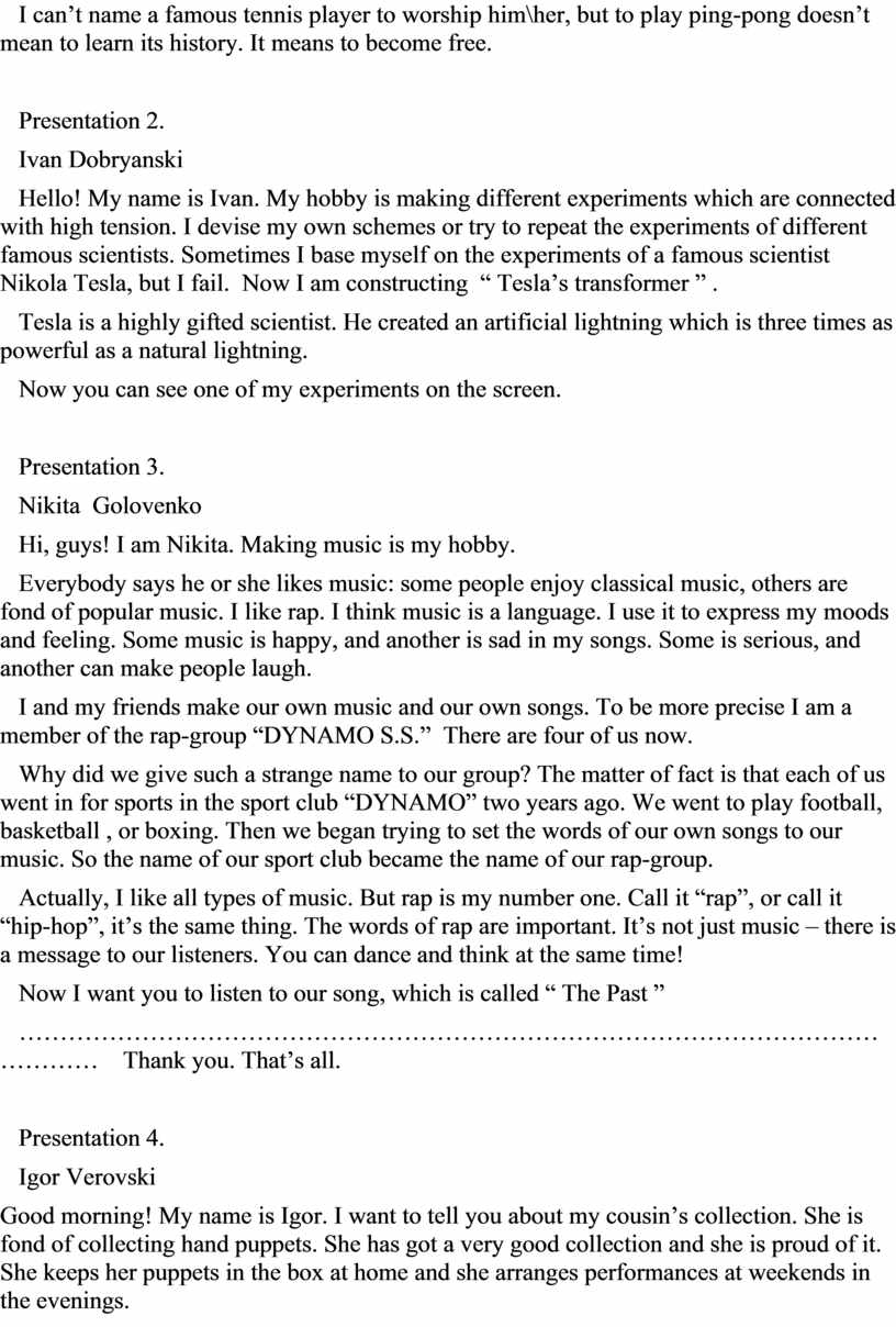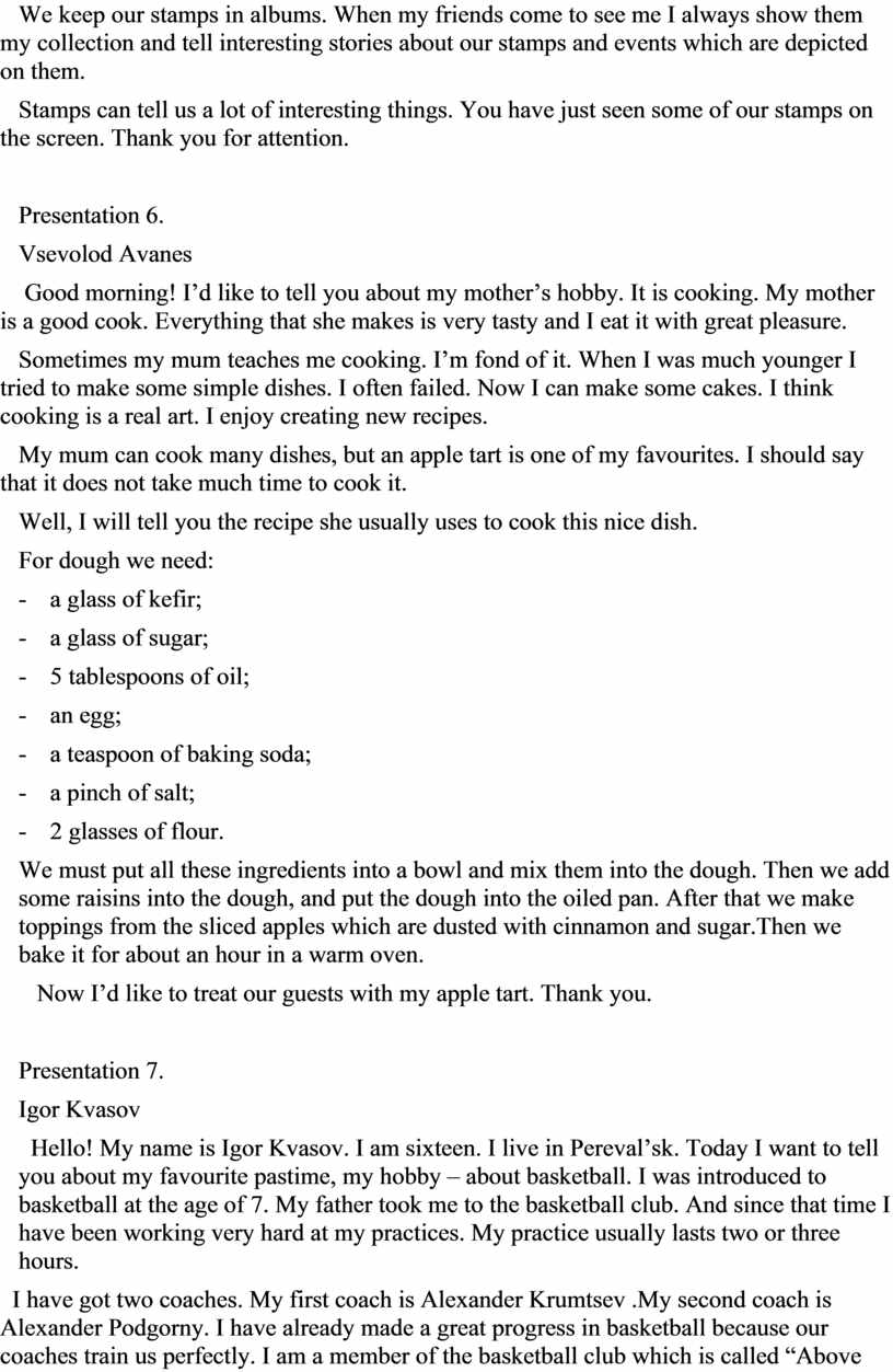 Hello! My name is Igor Kvasov. I am sixteen. I live in Pereval’sk. Today I want to tell you about my favourite pastime, my hobby – about basketball. I was introduced to basketball at the age of 7. My father took me to the basketball club. And since that time I have been working very hard at my practices. My practice usually lasts two or three hours.