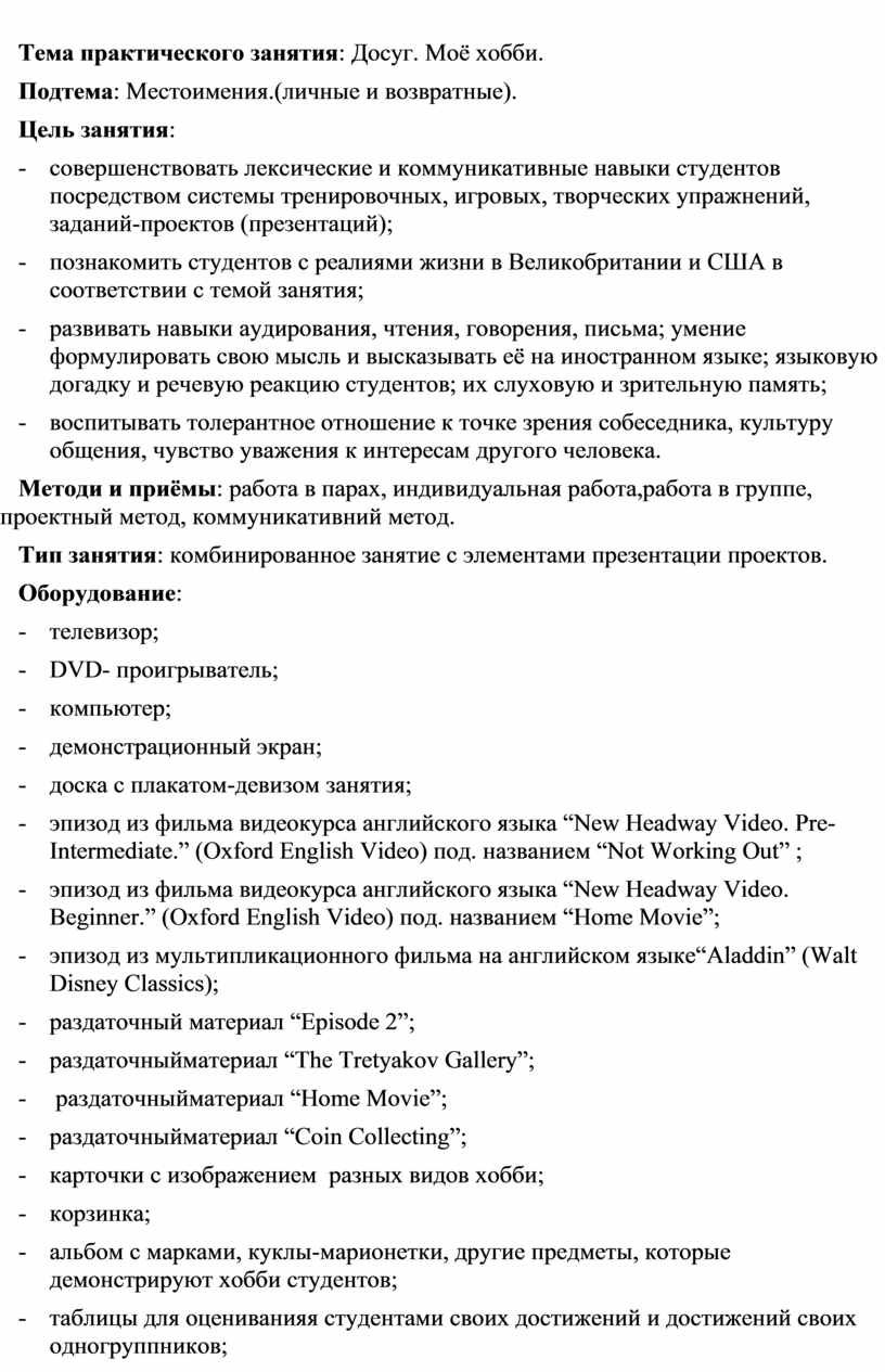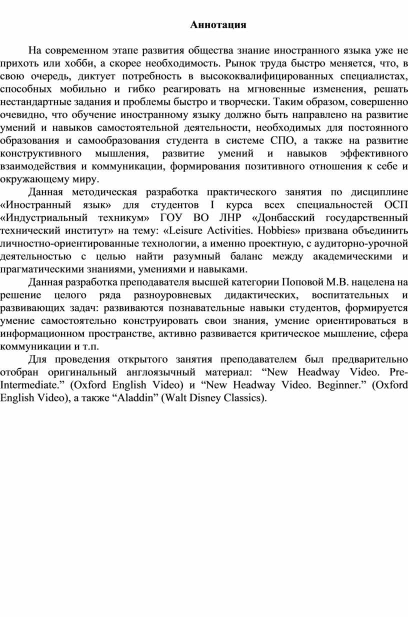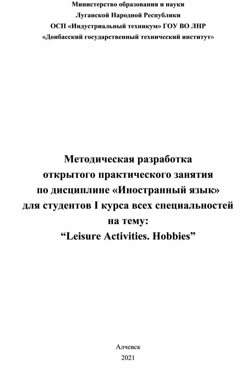 Данная методическая разработка практического занятия по дисциплине «Иностранный язык» для студентов I курса всех специальностей ОСП «Индустриальный техникум» ГОУ ВО ЛНР «Донбасский государственный технический институт» на тему: «Leisure Activities. Hobbies» призвана объединить личностно-ориентированные технологии, а именно проектную, с аудиторно-урочной деятельностью с целью найти разумный баланс между академическими и прагматическими знаниями, умениями и навыками.