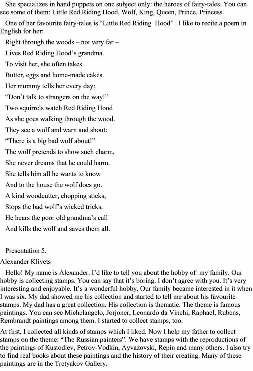 Hello! My name is Alexander. I’d like to tell you about the hobby of my family. Our hobby is collecting stamps. You can say that it’s boring. I don’t agree with you. It’s very interesting and enjoyable. It’s a wonderful hobby. Our family became interested in it when I was six. My dad showed me his collection and started to tell me about his favourite stamps. My dad has a great collection. His collection is thematic. The theme is famous paintings. You can see Michelangelo, Jorjoner, Leonardo da Vinchi, Raphael, Rubens, Rembrandt paintings among them. I started to collect stamps, too.