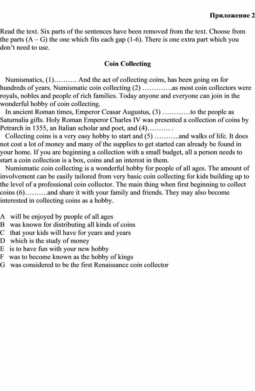 T.: Dear students! Your home task is to read and translate the text “Coin collecting” and to fill in the gaps of the text/