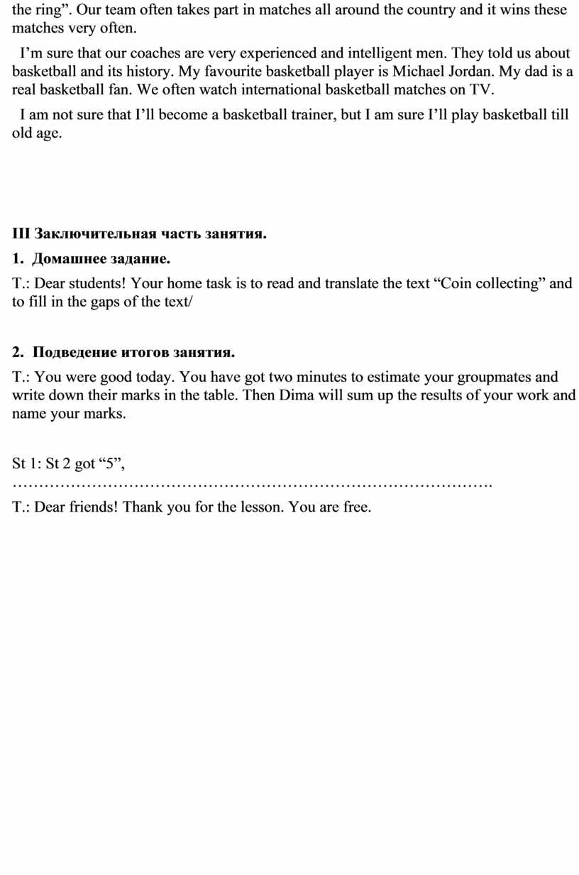 I’m sure that our coaches are very experienced and intelligent men. They told us about basketball and its history. My favourite basketball player is Michael Jordan. My dad is a real basketball fan. We often watch international basketball matches on TV.