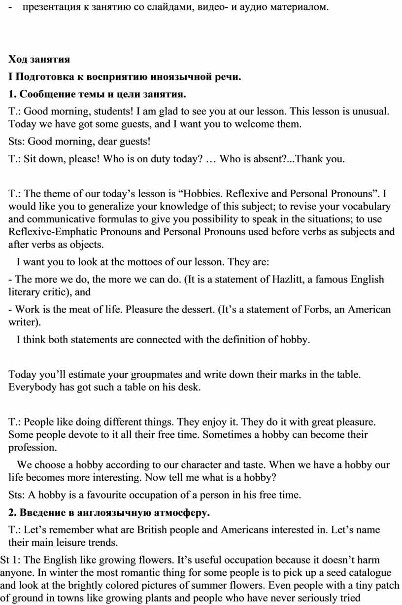 T.: The theme of our today’s lesson is “Hobbies. Reflexive and Personal Pronouns”. I would like you to generalize your knowledge of this subject; to revise your vocabulary and communicative formulas to give you possibility to speak in the situations; to use Reflexive-Emphatic Pronouns and Personal Pronouns used before verbs as subjects and after verbs as objects.