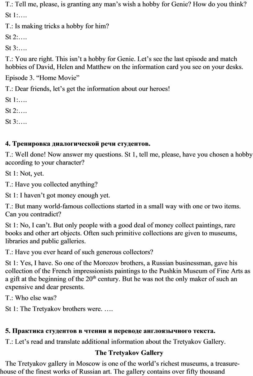 T.: Good morning, students! I am glad to see you at our lesson. This lesson is unusual. Today we have got some guests, and I want you to welcome them.