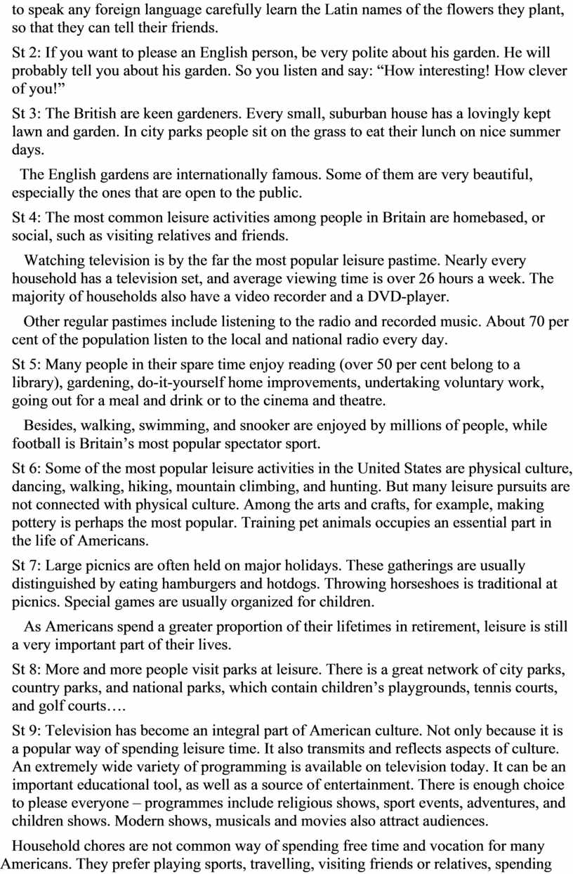 T.: Let’s remember what are British people and Americans interested in. Let’s name their main leisure trends.