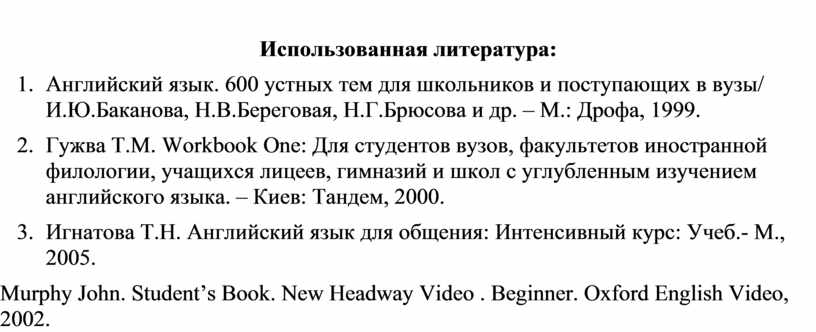 1. Английский язык. 600 устных тем для школьников и поступающих в вузы/ И.Ю.Баканова, Н.В.Береговая, Н.Г.Брюсова и др. – М.: Дрофа, 1999.