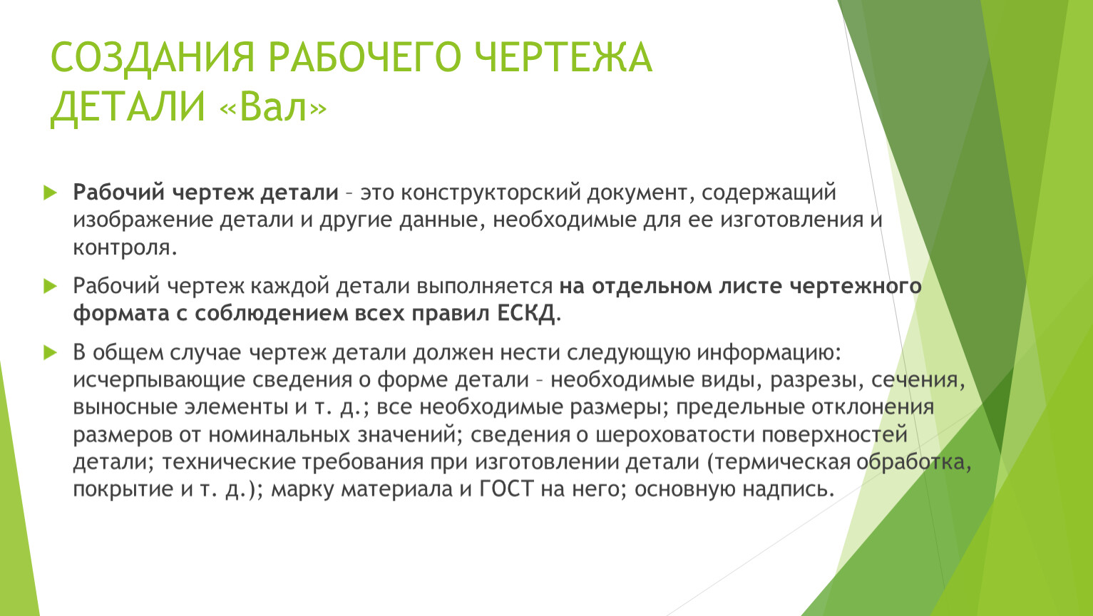 В общем случае чертеж детали должен нести следующую информацию: исчерпывающие сведения о форме детали – необходимые виды, разрезы, сечения, выносные элементы и т. д.; все необходимые размеры; предельные отклонения размеров от номинальных значений; сведения о шероховатости поверхностей детали; технические требования при изготовлении детали (термическая обработка, покрытие и т. д.); марку материала и ГОСТ на него; основную надпись.