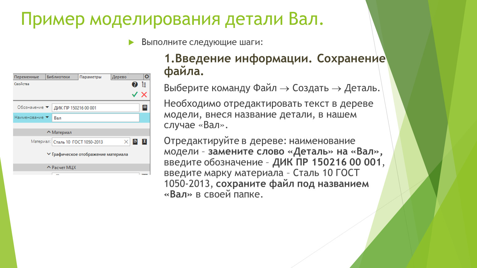 Отредактируйте в дереве: наименование модели – замените слово «Деталь» на «Вал», введите обозначение – ДИК ПР 150216 00 001, введите марку материала – Сталь 10 ГОСТ 1050-2013, сохраните файл под названием «Вал» в своей папке.