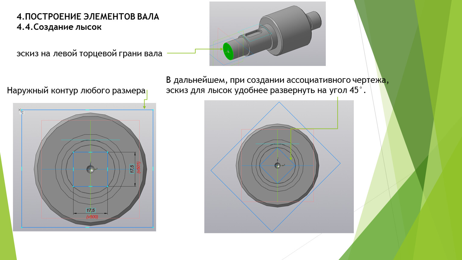 В дальнейшем, при создании ассоциативного чертежа, эскиз для лысок удобнее развернуть на угол 45°.