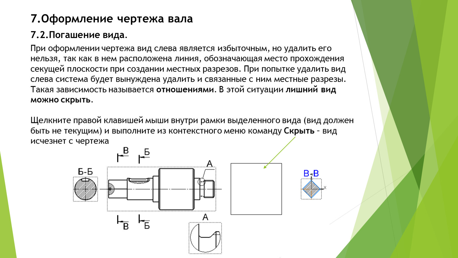 При оформлении чертежа вид слева является избыточным, но удалить его нельзя, так как в нем расположена линия, обозначающая место прохождения секущей плоскости при создании местных разрезов. При попытке удалить вид слева система будет вынуждена удалить и связанные с ним местные разрезы. Такая зависимость называется отношениями. В этой ситуации лишний вид можно скрыть.