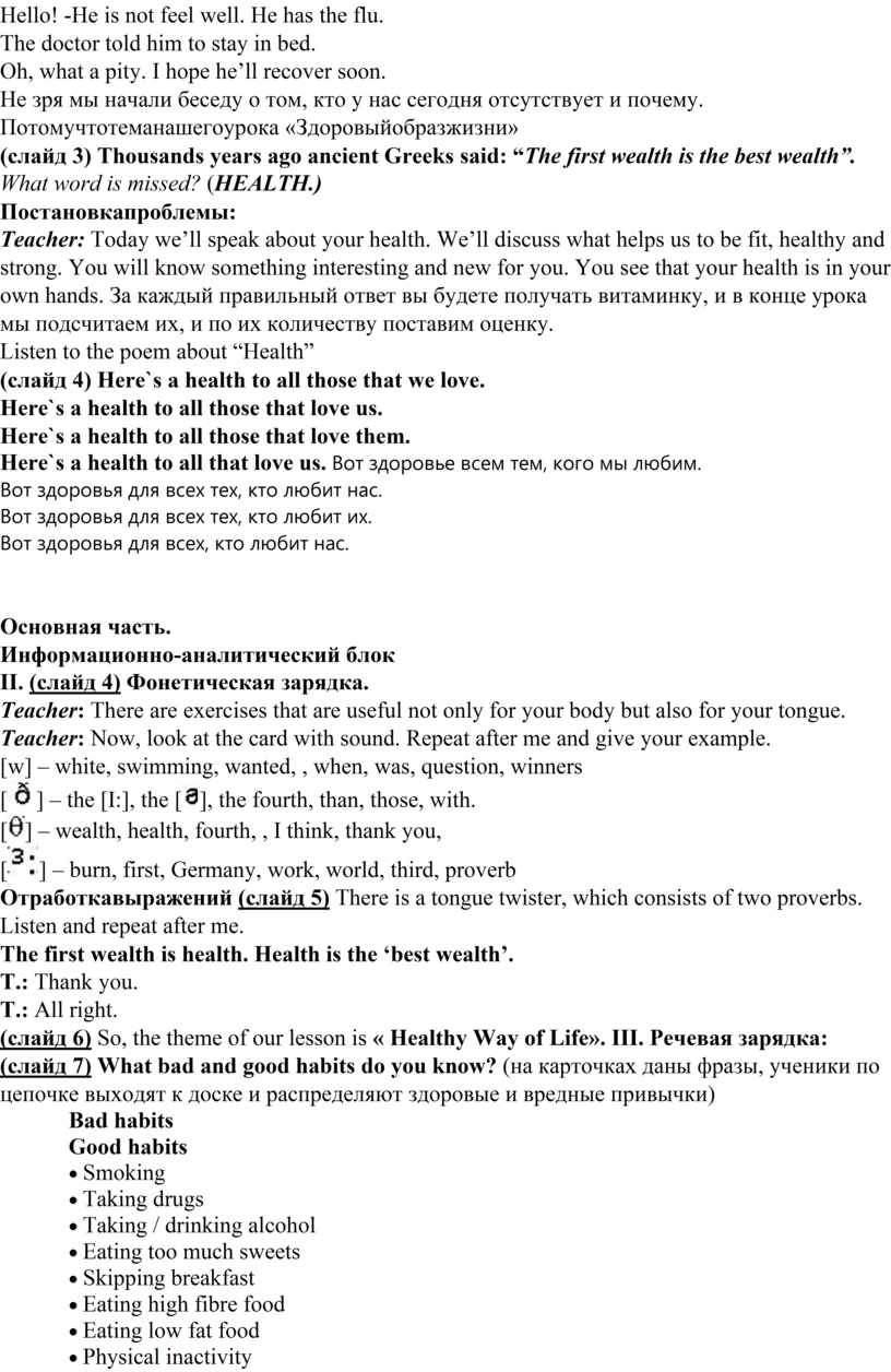 (слайд 6) So, the theme of our lesson is « Healthy Way of Life». III. Речевая зарядка: