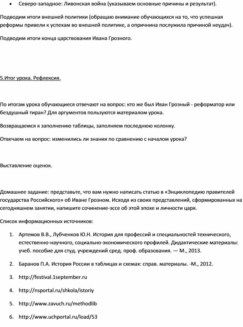 По итогам урока обучающиеся отвечают на вопрос: кто же был Иван Грозный - реформатор или бездушный тиран? Для аргументов пользуются материалом урока.