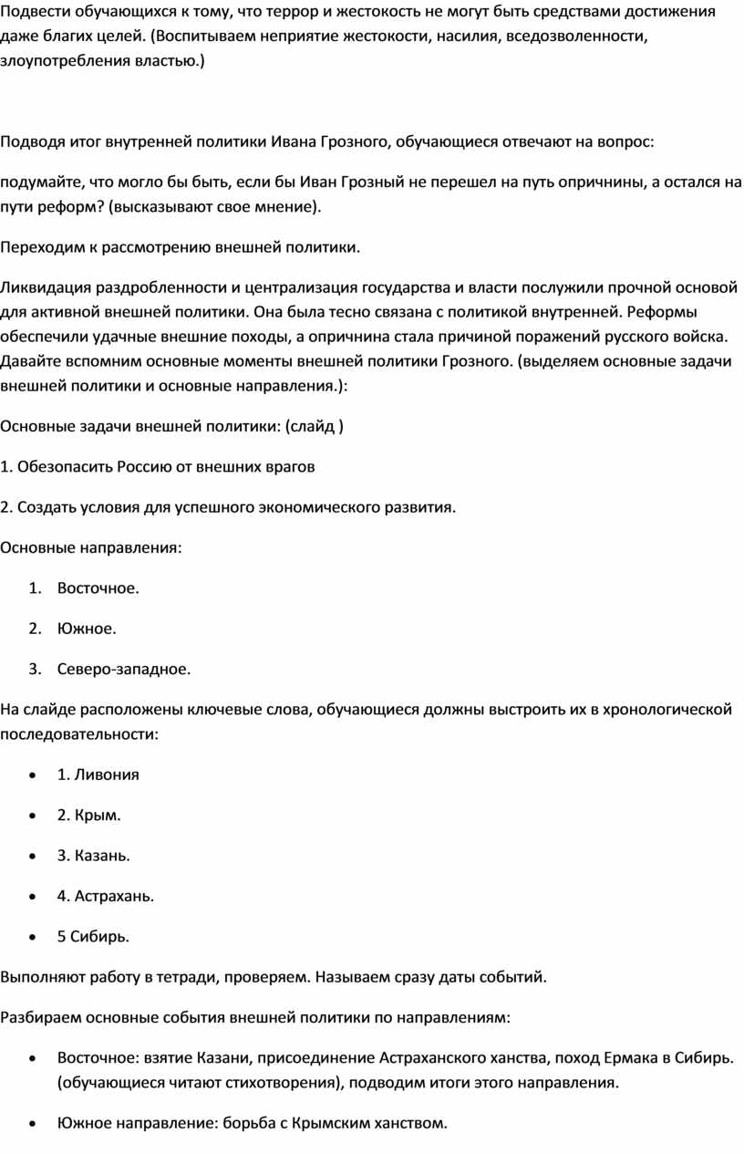 Ликвидация раздробленности и централизация государства и власти послужили прочной основой для активной внешней политики. Она была тесно связана с политикой внутренней. Реформы обеспечили удачные внешние походы, а опричнина стала причиной поражений русского войска. Давайте вспомним основные моменты внешней политики Грозного. (выделяем основные задачи внешней политики и основные направления.):