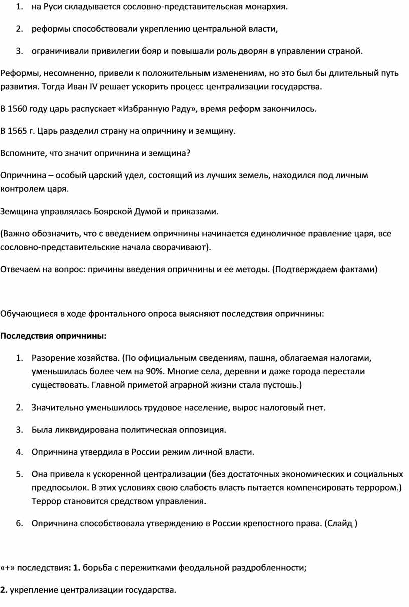(Важно обозначить, что с введением опричнины начинается единоличное правление царя, все сословно-представительские начала сворачивают).