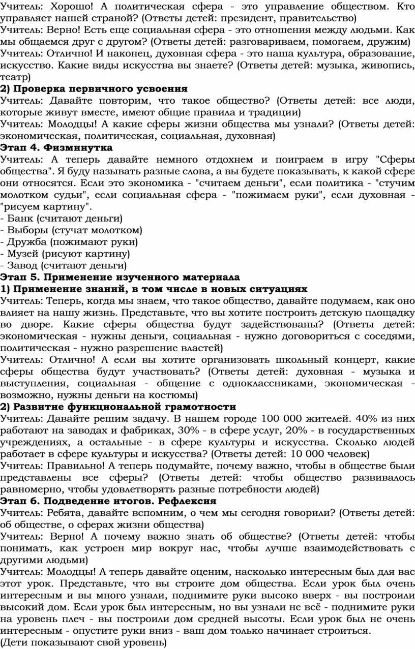Учитель: Теперь, когда мы знаем, что такое общество, давайте подумаем, как оно влияет на нашу жизнь. Представьте, что вы хотите построить детскую площадку во дворе. Какие сферы общества будут задействованы? (Ответы детей: экономическая - нужны деньги, социальная - нужно договориться с соседями, политическая - нужно разрешение властей)