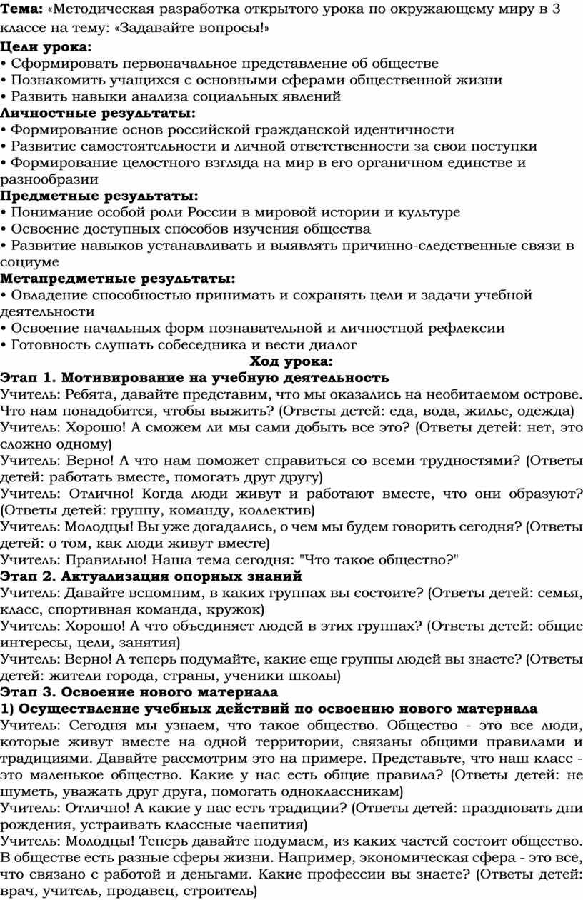 Тема: «Методическая разработка открытого урока по окружающему миру в 3 классе на тему: «Задавайте вопросы!»