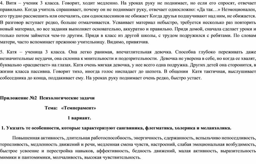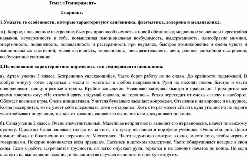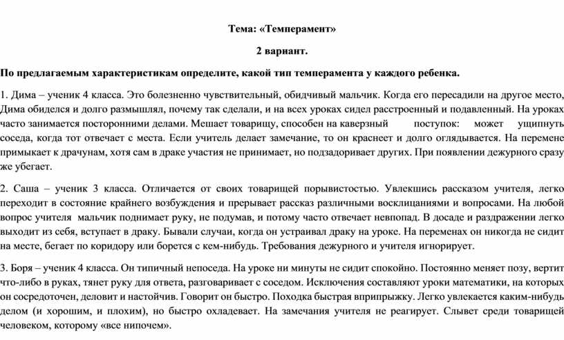 На основании характеристик, которые даются ниже, определите типы темперамента школьников.