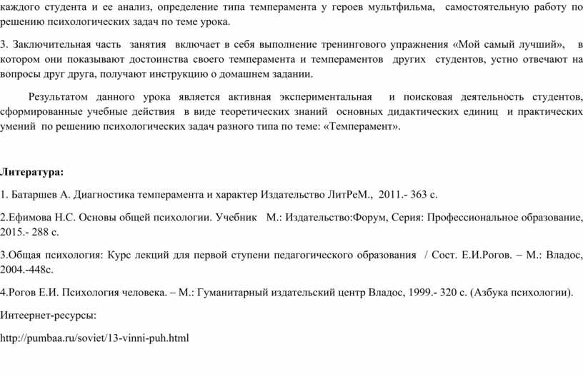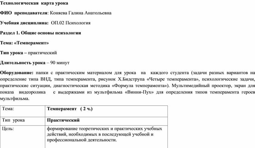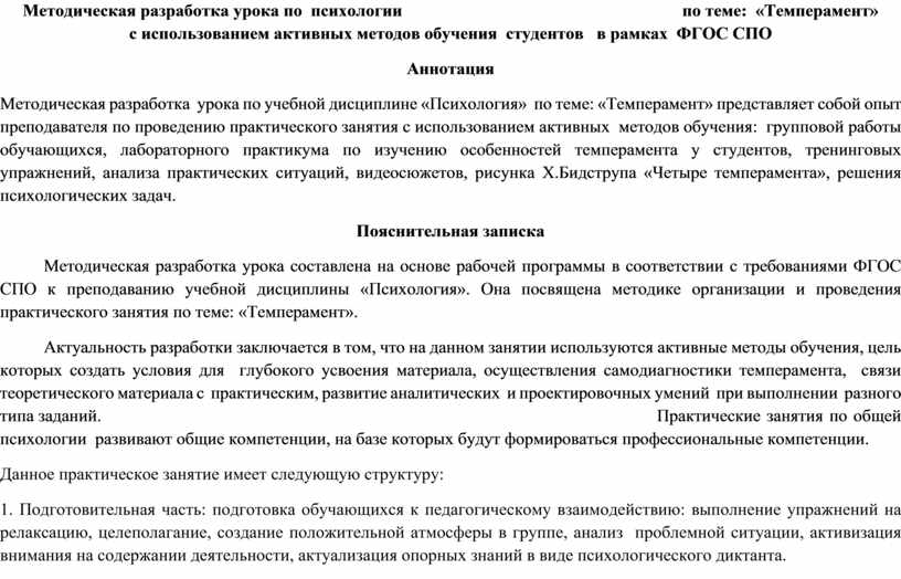 Методическая разработка урока по учебной дисциплине «Психология» по теме: «Темперамент» представляет собой опыт преподавателя по проведению практического занятия с использованием активных методов обучения: групповой работы обучающихся, лабораторного практикума по изучению особенностей темперамента у студентов, тренинговых упражнений, анализа практических ситуаций, видеосюжетов, рисунка Х.Бидструпа «Четыре темперамента», решения психологических задач.