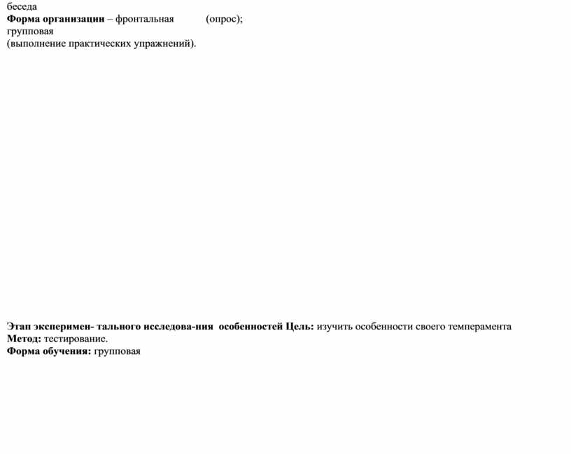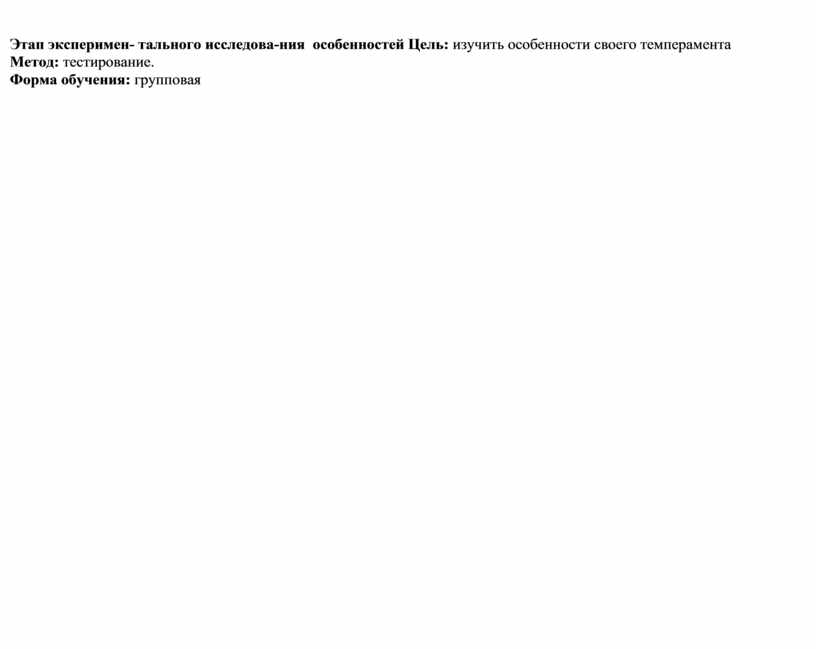 Этап эксперимен- тального исследова-ния особенностей Цель: изучить особенности своего темперамента Метод: тестирование. Форма обучения: групповая