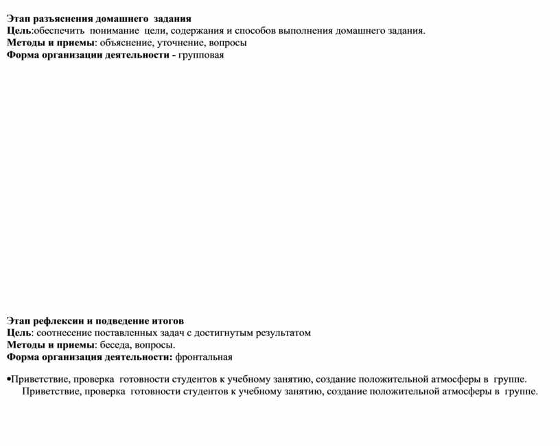 Этап разъяснения домашнего задания Цель:обеспечить понимание цели, содержания и способов выполнения домашнего задания. Методы и приемы: объяснение, уточнение, вопросы Форма организации деятельности - групповая
