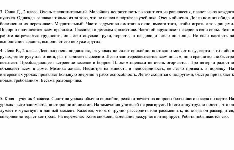 3. Саша Д., 2 класс. Очень впечатлительный. Малейшая неприятность выводит его из равновесия, плачет из-за каждого пустяка. Однажды заплакал только из-за того, что не нашел в портфеле учебника. Очень обидчив. Долго помнит обиды и болезненно их переживает. Медлительный. Часто задумчиво смотрит в окно, вместо того, чтобы играть с товарищами. Покорно подчиняется всем правилам. Пассивен в детском коллективе. Часто обнаруживает неверие в свои силы. Если в работе встречаются трудности, он легко опускает руки, теряется и не доводит дело до конца. Но если настоять на выполнении задания, выполняет его не хуже других.