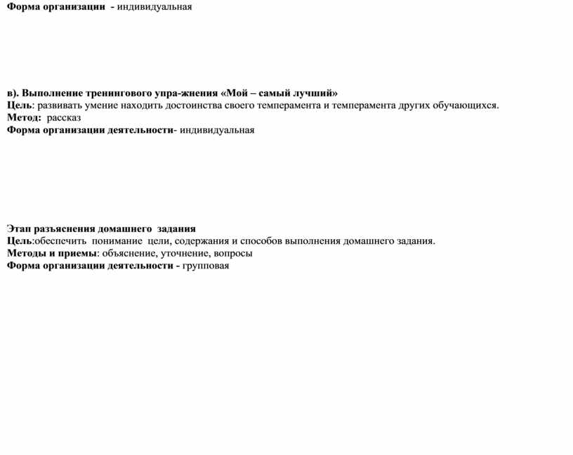в). Выполнение тренингового упра-жнения «Мой – самый лучший» Цель: развивать умение находить достоинства своего темперамента и темперамента других обучающихся. Метод: рассказ Форма организации деятельности- индивидуальная