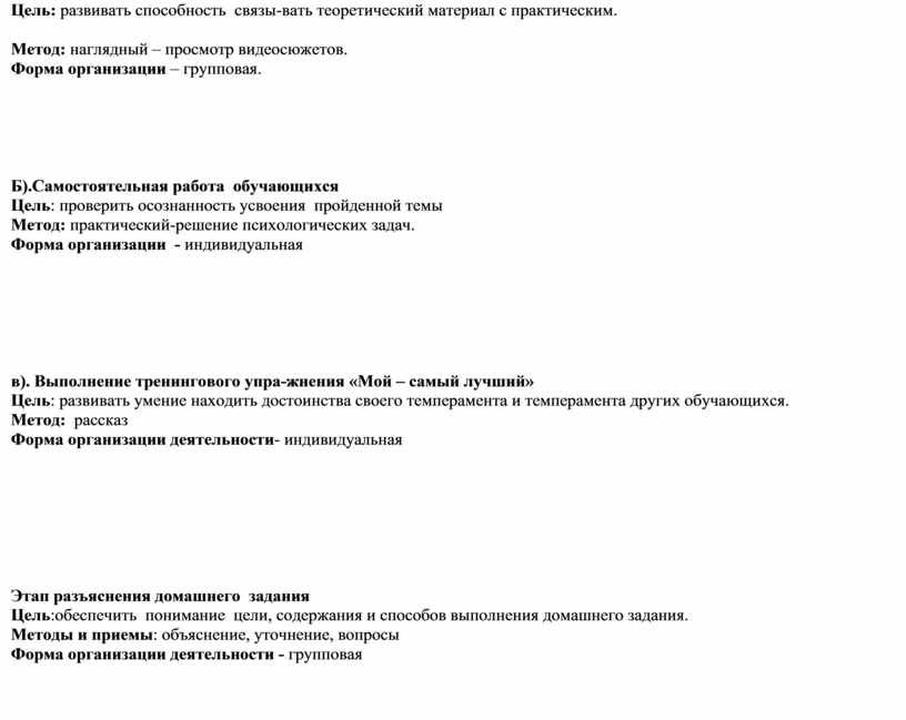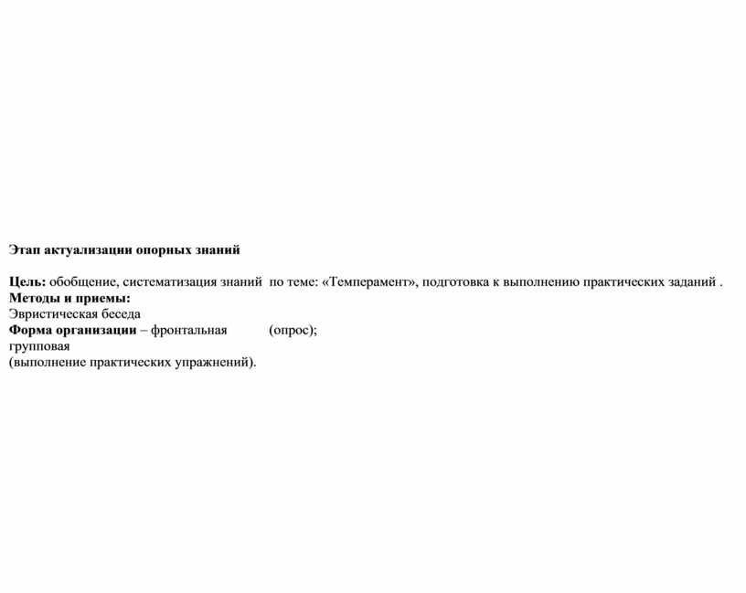 Цель: обобщение, систематизация знаний по теме: «Темперамент», подготовка к выполнению практических заданий . Методы и приемы: Эвристическая беседа Форма организации – фронтальная (опрос); групповая (выполнение практических упражнений).