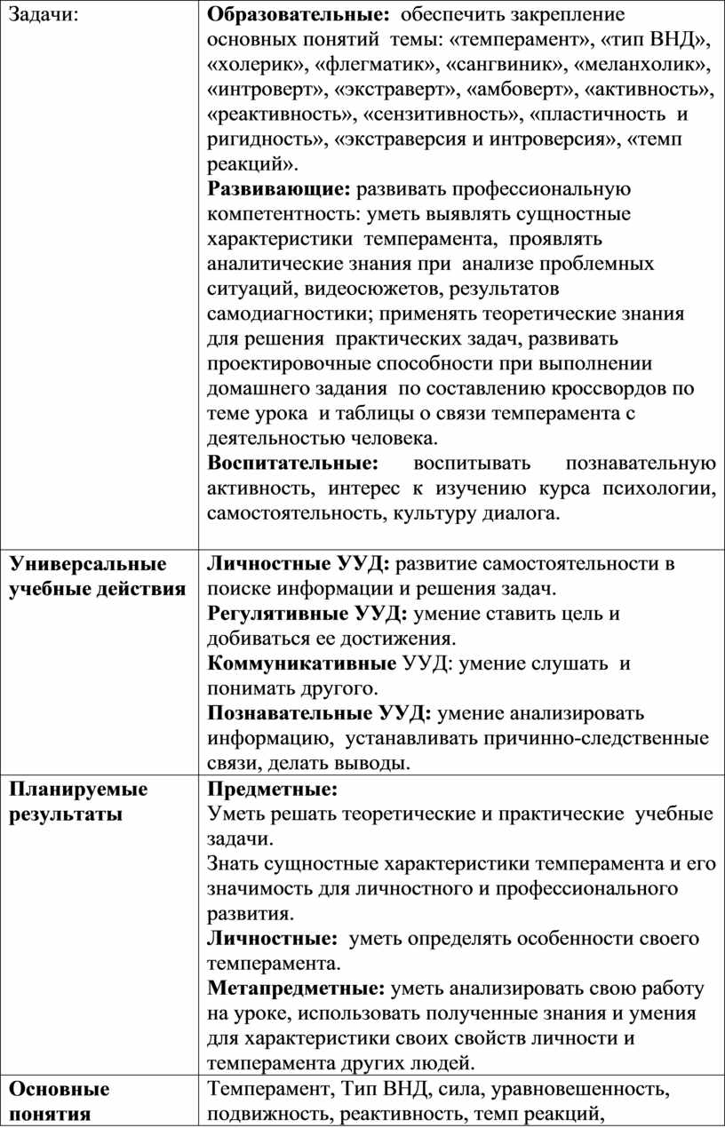 Образовательные: обеспечить закрепление основных понятий темы: «темперамент», «тип ВНД», «холерик», «флегматик», «сангвиник», «меланхолик», «интроверт», «экстраверт», «амбоверт», «активность», «реактивность», «сензитивность», «пластичность и ригидность», «экстраверсия и интроверсия», «темп реакций». Развивающие: развивать профессиональную компетентность: уметь выявлять сущностные характеристики темперамента, проявлять аналитические знания при анализе проблемных ситуаций, видеосюжетов, результатов самодиагностики; применять теоретические знания для решения практических задач, развивать проектировочные способности при выполнении домашнего задания по составлению кроссвордов по теме урока и таблицы о связи темперамента с деятельностью человека. Воспитательные: воспитывать познавательную активность, интерес к изучению курса психологии, самостоятельность, культуру диалога.